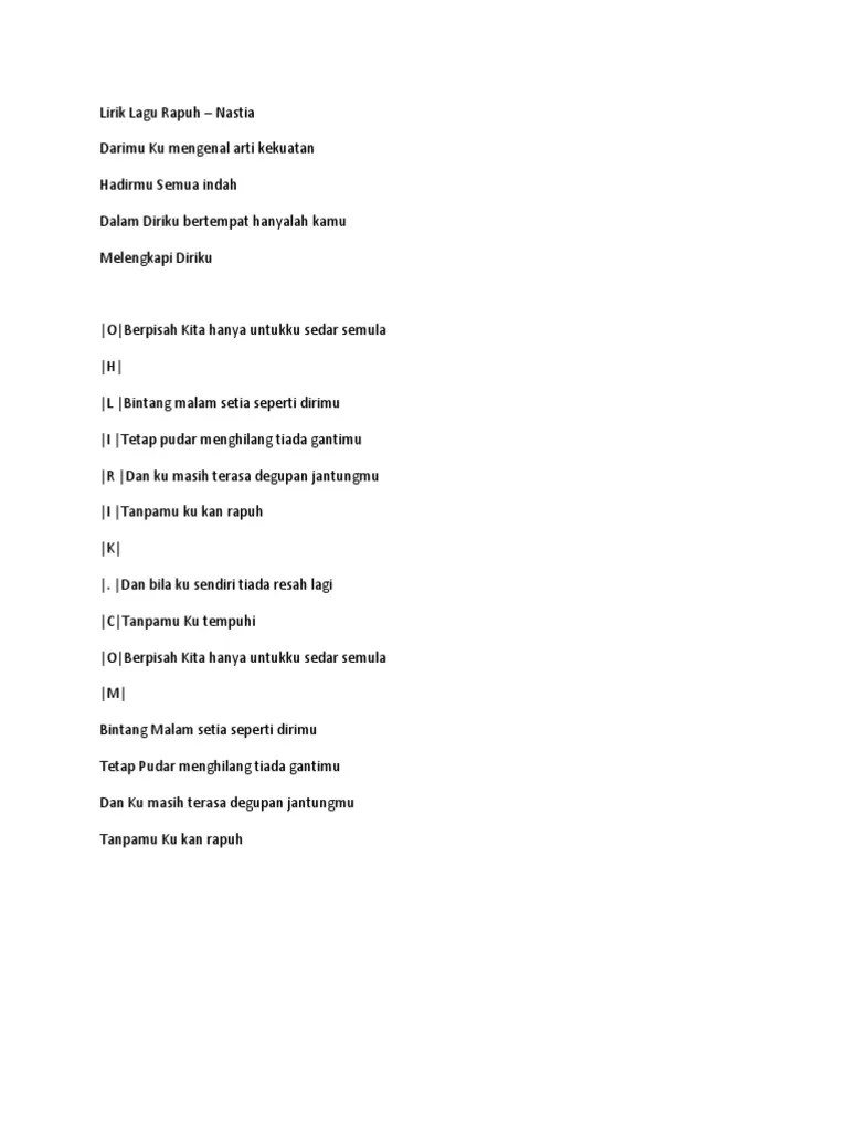 F g c f g c g7 c g c aku masih seperti yang dulu. C g c oh kasih oh sayang. G d malam ini ku sendiri. C f cinta dan kerinduan. Tap on highlighted lyrics to explain. Mungkin malam ini ku tak bisa datang temani dirimu sayang. Em b tak ada yang menemani. C f c malam ini tak ingin aku sendiri F g menunggumu sampai akhir hidupku C g c g untukmu dambaan kalbuku. G d hati ini selalu sepi Malam ini aku sendiri lagi. Chord gitar aku masih seperti yang dulu kunci g malam ini tak ingin aku sendiri.